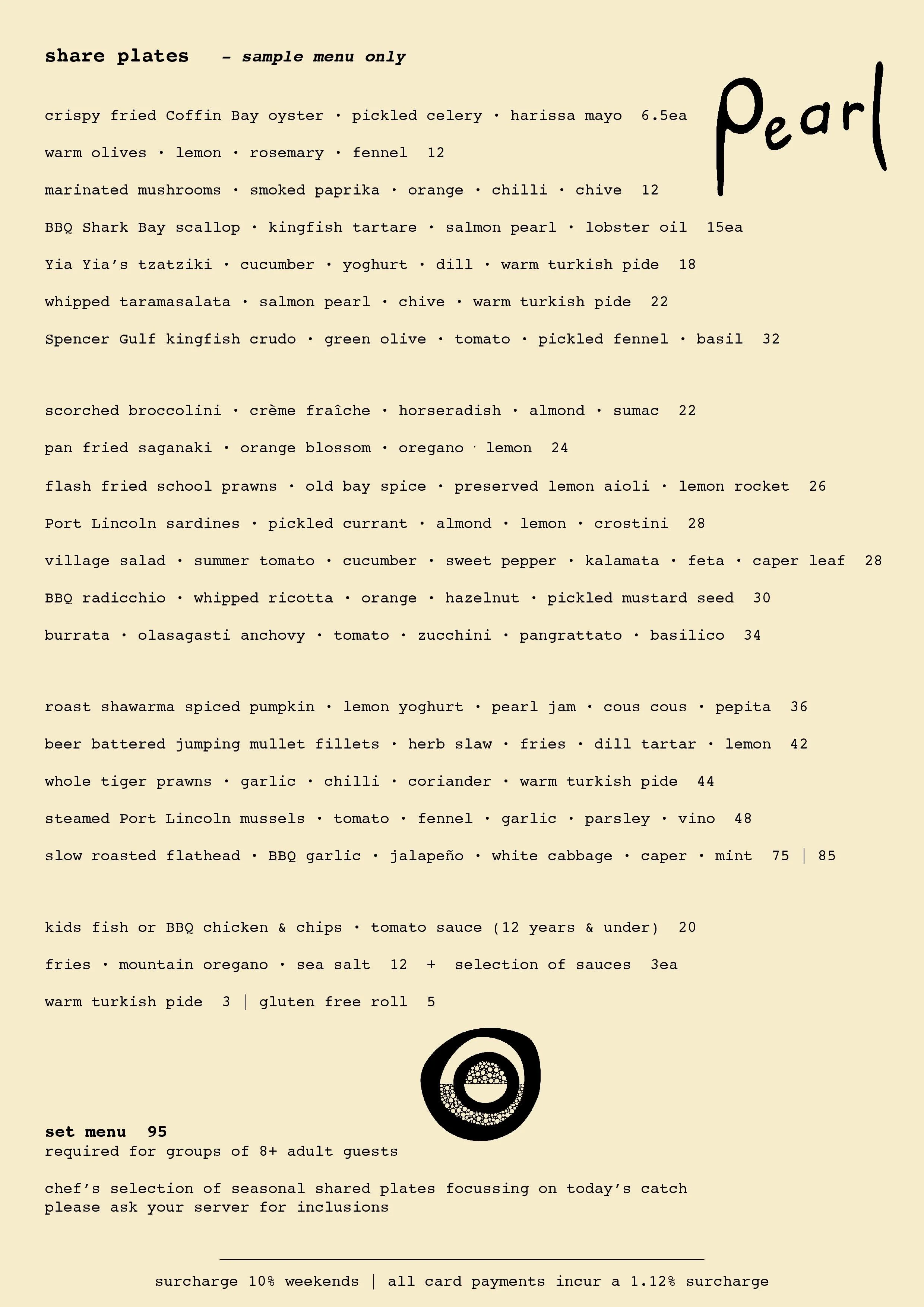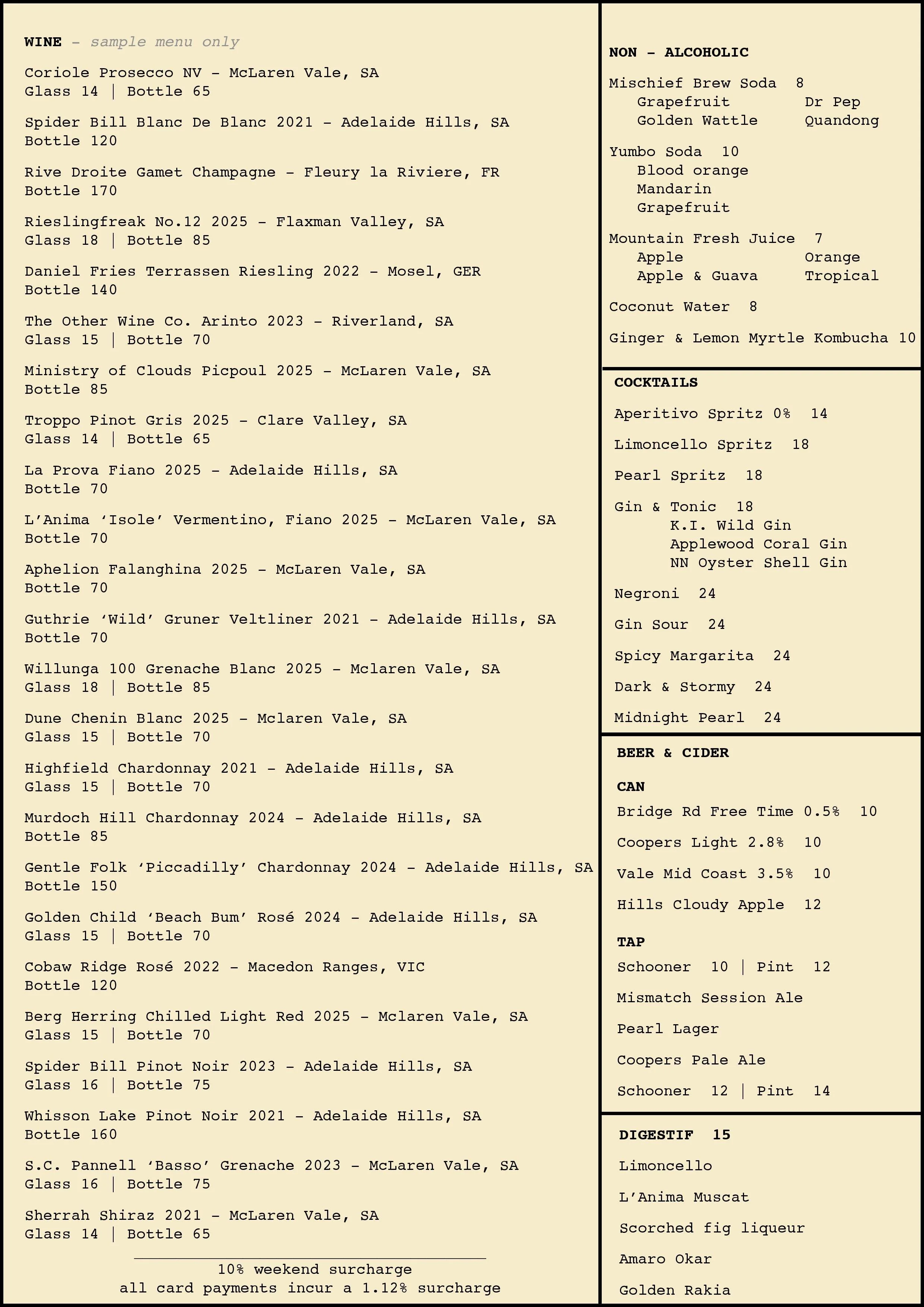 Pearl has a strong focus on fresh South Australian seafood and local garden harvest. Our menu will change according to availability & seasonality
